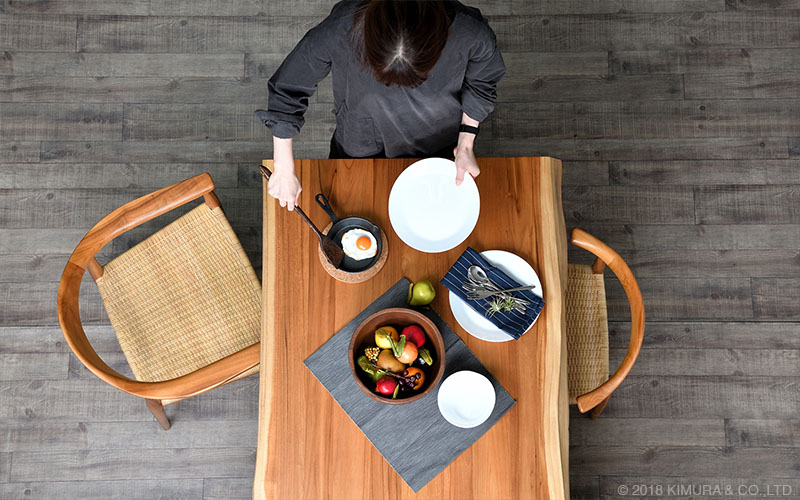 ポイント | 現代の日本のライフスタイルに合わせてデザインされたダイニングテーブル。ひとつひとつ個性がある、チークの木そのものの形を活かしたデザイン。普段の生活にも自然の中で感じるようなリラックス空間を演出します。 |